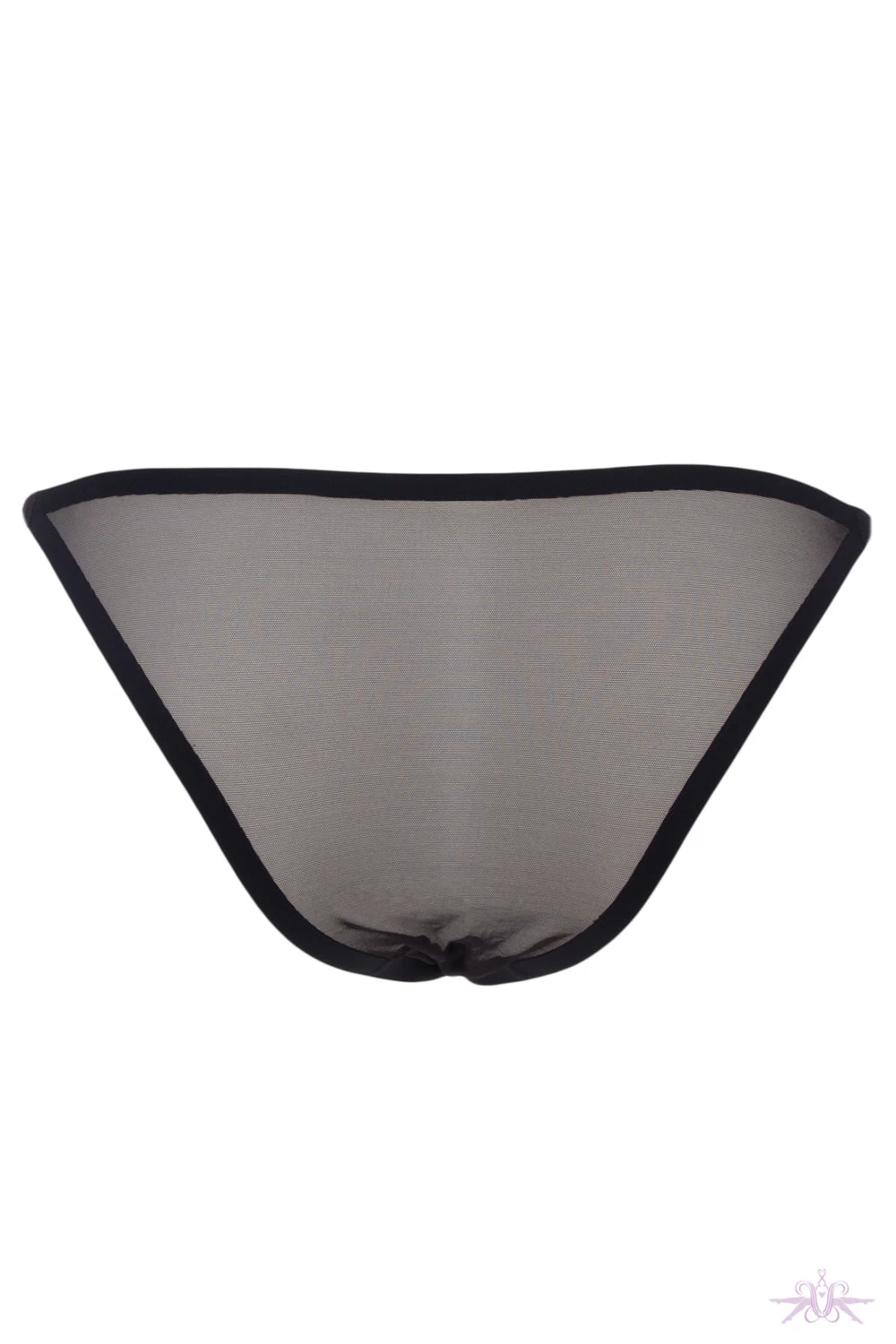 A beautiful sensual brief in a soft and transparent black tulle from Atelier Amour. Its simple opening on either side with small golden clips and buttons is just so elegant. It is perfect with the matching bra, top and suspender belt.