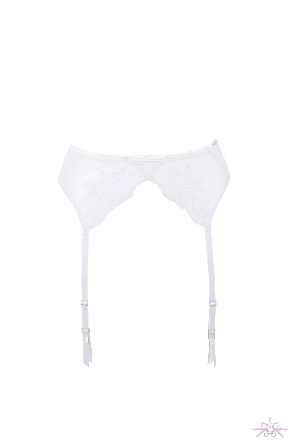 A beautiful white suspender belt from the Marseille collection at Bluebella. The intricate floral embroidery distinguishes the belt and the waist sculpts the body with grace and it is secured at the back with hook-and-eye fastenings. Style with the Marseille bra and briefs.