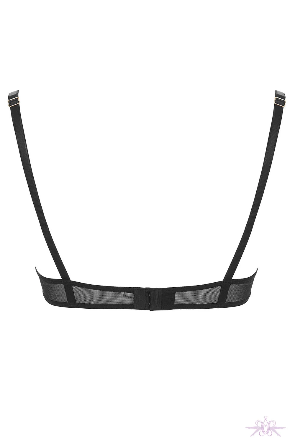 Gorgeous open cup bra with cut out design in guipure lace. This bra compliments your bust with delicate floral lace accents which adorn the underwired open cups. A slimline sheer strap to the rear with adjustable hook and eye fastenings enable the perfect fit. Pair with matching suspender belt, thong and brief.