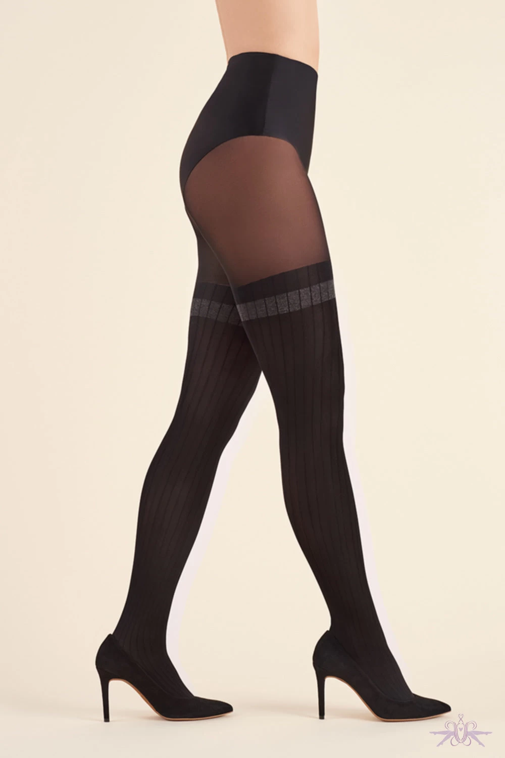 A beautiful opaque mock hold up tight from Gabriella. The leg is opaque with a fine vertical line and horizontal faux grey stay up band. The thigh to the waist is sheer.Â