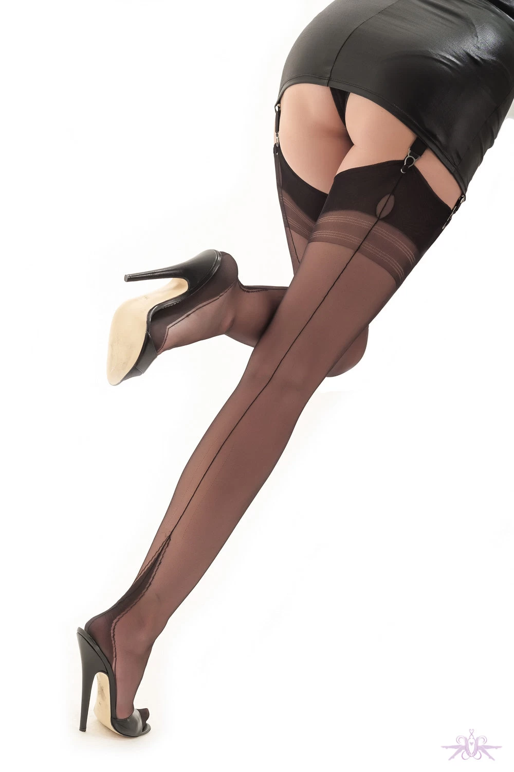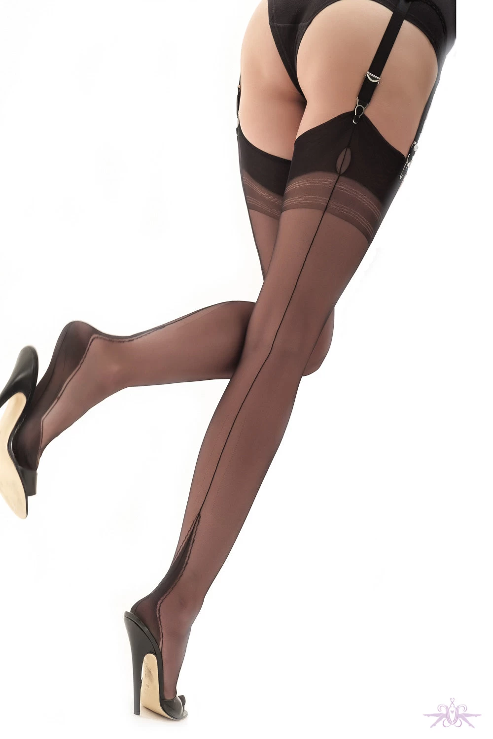 These exquisite Harmony Point heel stockings traditionally made in the UK by Gio, are in the class of a French heel. Combining the seamed leg with a heel tapering off to a point with outlining shadow, to accentuate the length and shape of the leg. These 100% Nylon fully-fashioned stockings are designed to fit the leg perfectly. They are 15 denier, high-gloss and sheer, yet silky smooth to the touch.