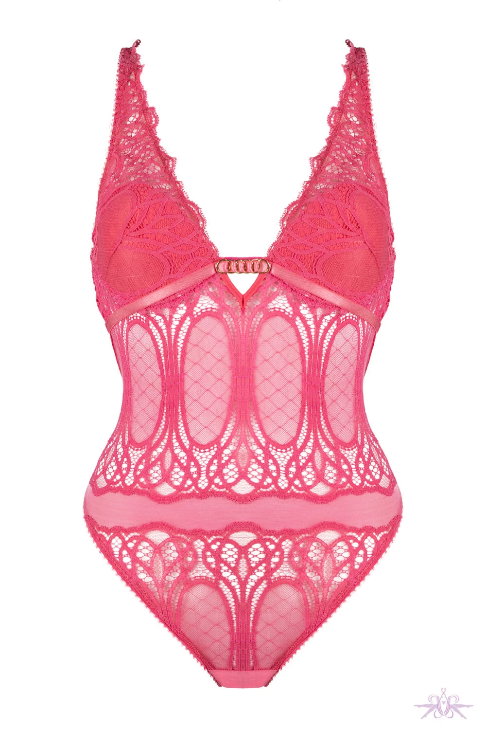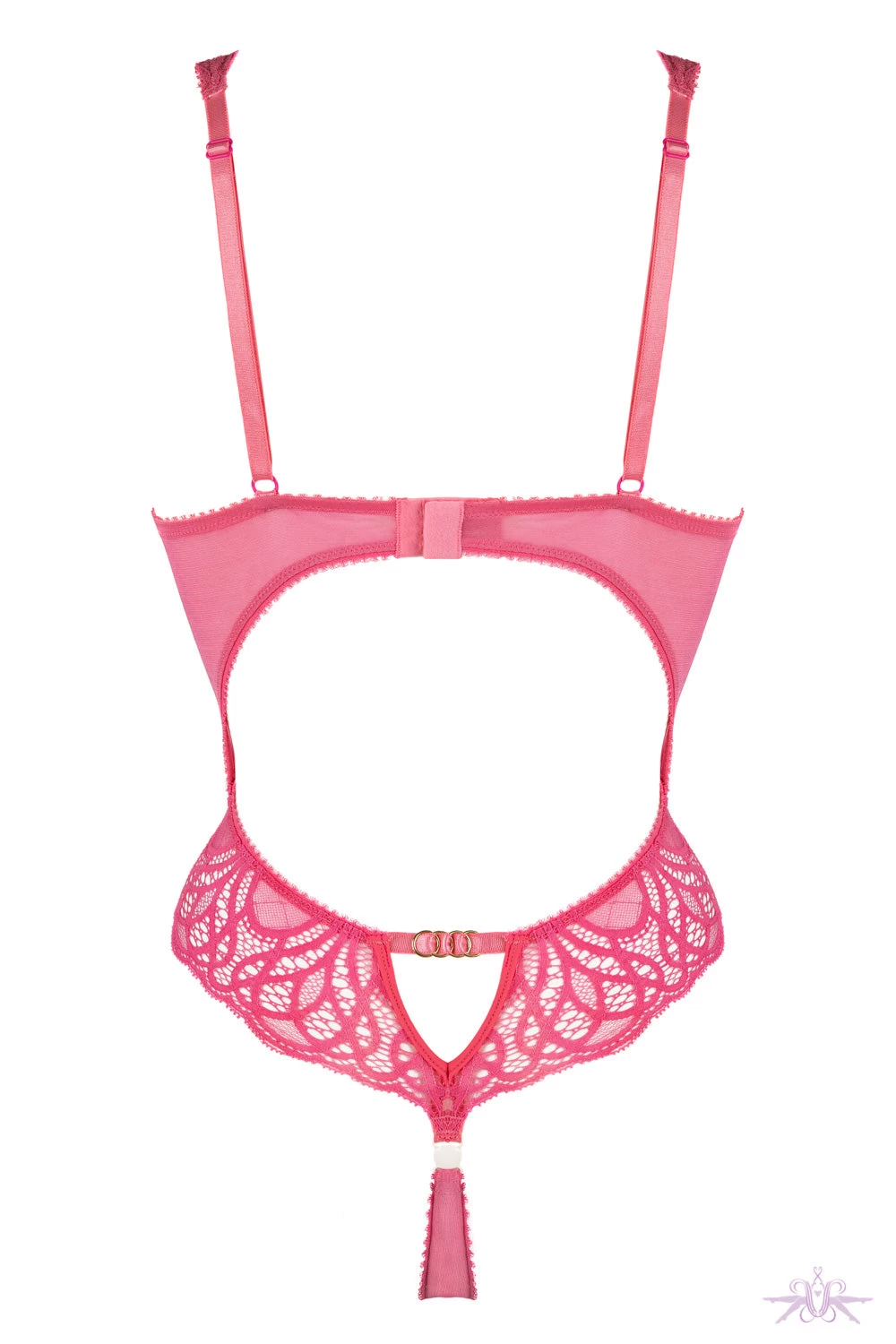A beautifully seductive lace bodysuit from the Angels collection at Jolidon. This bodysuit will enhance the feminine curves with its sheer floral lace panels and underwired bust. The cups are slightly padded and an elastic strap adorned with gold circles sits underneath. The open back is very sensual and the thong is openable by a clip fastening.Â
