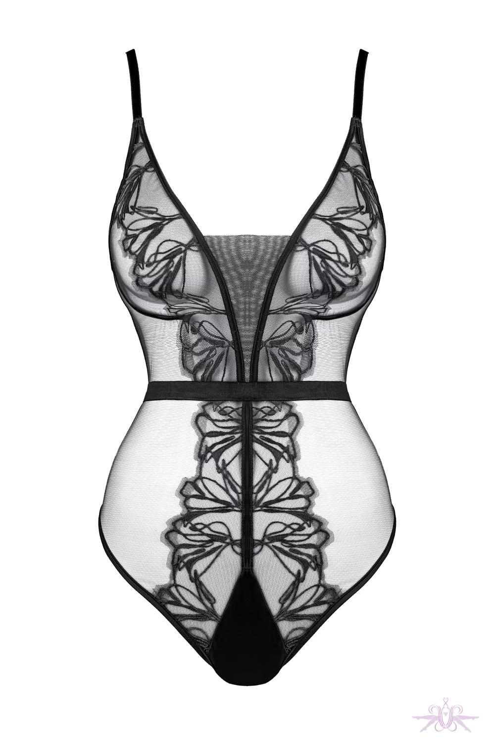 A beautifully seductive lace bodysuit from the Supreme collection at Jolidon. This bodysuit will enhance the feminine curves with its sheer floral lace panels and satin directional lines. The elastic band to the waist sits elegantly whilst the satin openable thong completes the look.Â