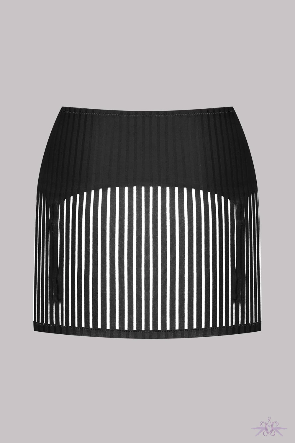 This lovely skirt from the Bande à Part collection at Maison Close is simply divine. The soft light fabric feels so decadent against the skin and the graphic lines add style creating that semi-sheer look. It has four removable and adjustable suspender clips. Matching thong, triangle bra and stockings are also available.
