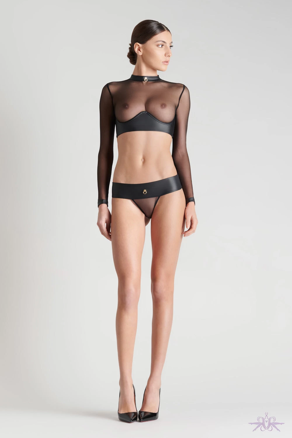 A gorgeous matte leather effect and sheer tulle long-sleeved top from the Chambre Noire collection at Maison Close. It opens with a zip with a golden ornamental trim at the back and has an adjustable fastener on the nape of the neck. An under band provides maximum support and the bust and bra is covered in contrasting transparent tulle. There is leather effect trim on the cuffs.