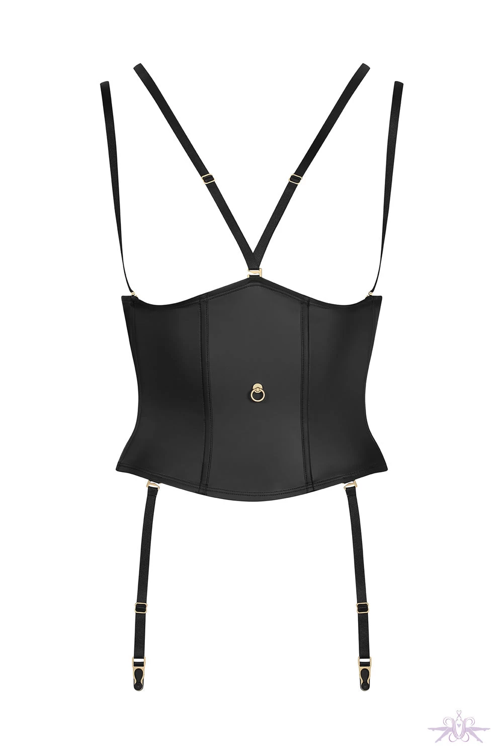 A beautiful matte leather look waist cincher from Maison Close. Really show off your curves in this stunning shape wear that enhances the waist. Suspenders, straps and choker harness are removable and can be adjusted with golden ornamental trims. The flexible vertical whalebones improve structure and support. Adjustable hook-and-eye fastening on the back. Matching items are also available.Â