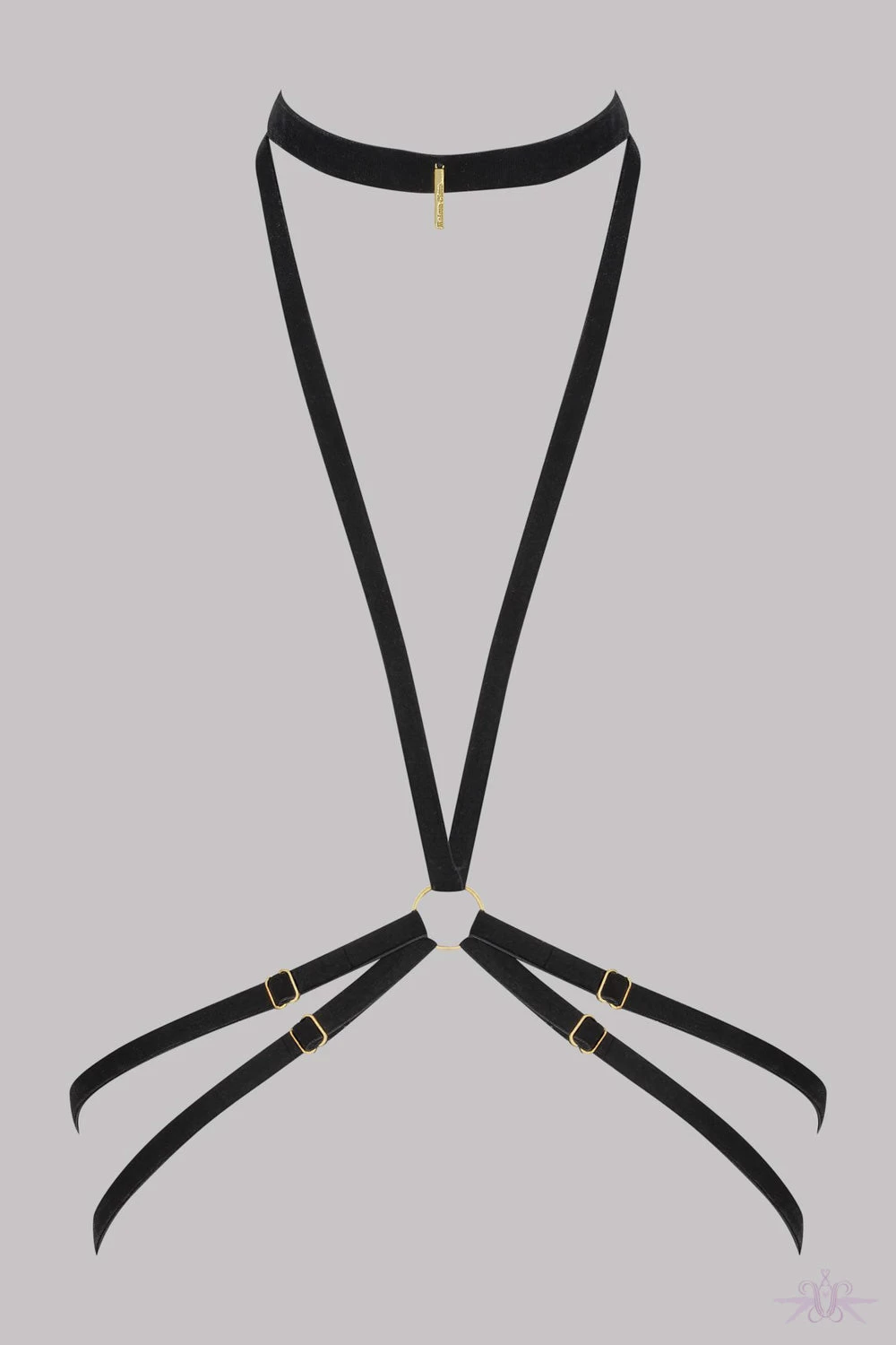 A luxurious velvet Harness from the Le Fetiches Collection at Maison Close. The harness is adjustable and can be worn with other le fetiches items to complete the look. The harness closes at the back, passes between the bust and ends around the neck, creating a choker effect embellished by an irresistible golden jewel.