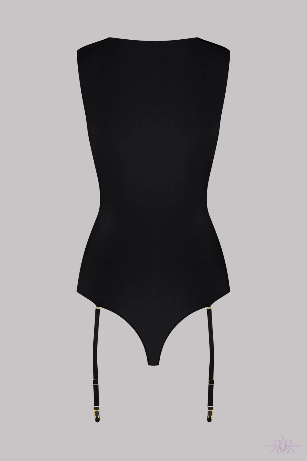 A luxurious sleeveless bodysuit with suspenders from the Madame Reve collection at Maison Close. This bodysuit in opaque microfiber has sheer mesh at the neck revealing the upper part of the body and an opaque back with thong. The suspenders are removable making this a versatile piece of lingerie. Â