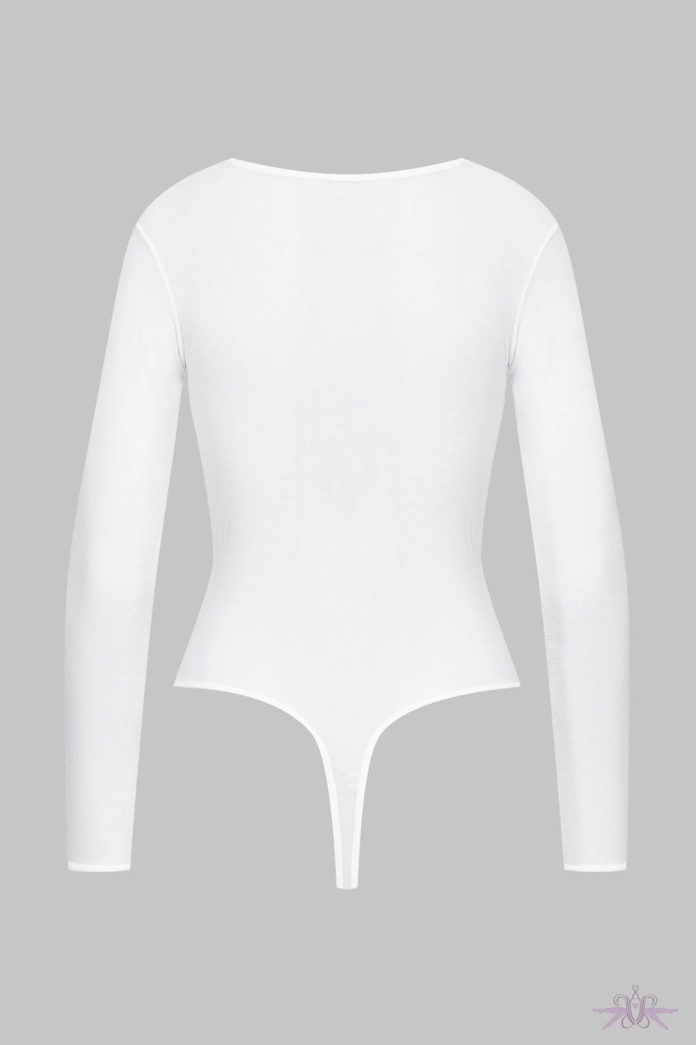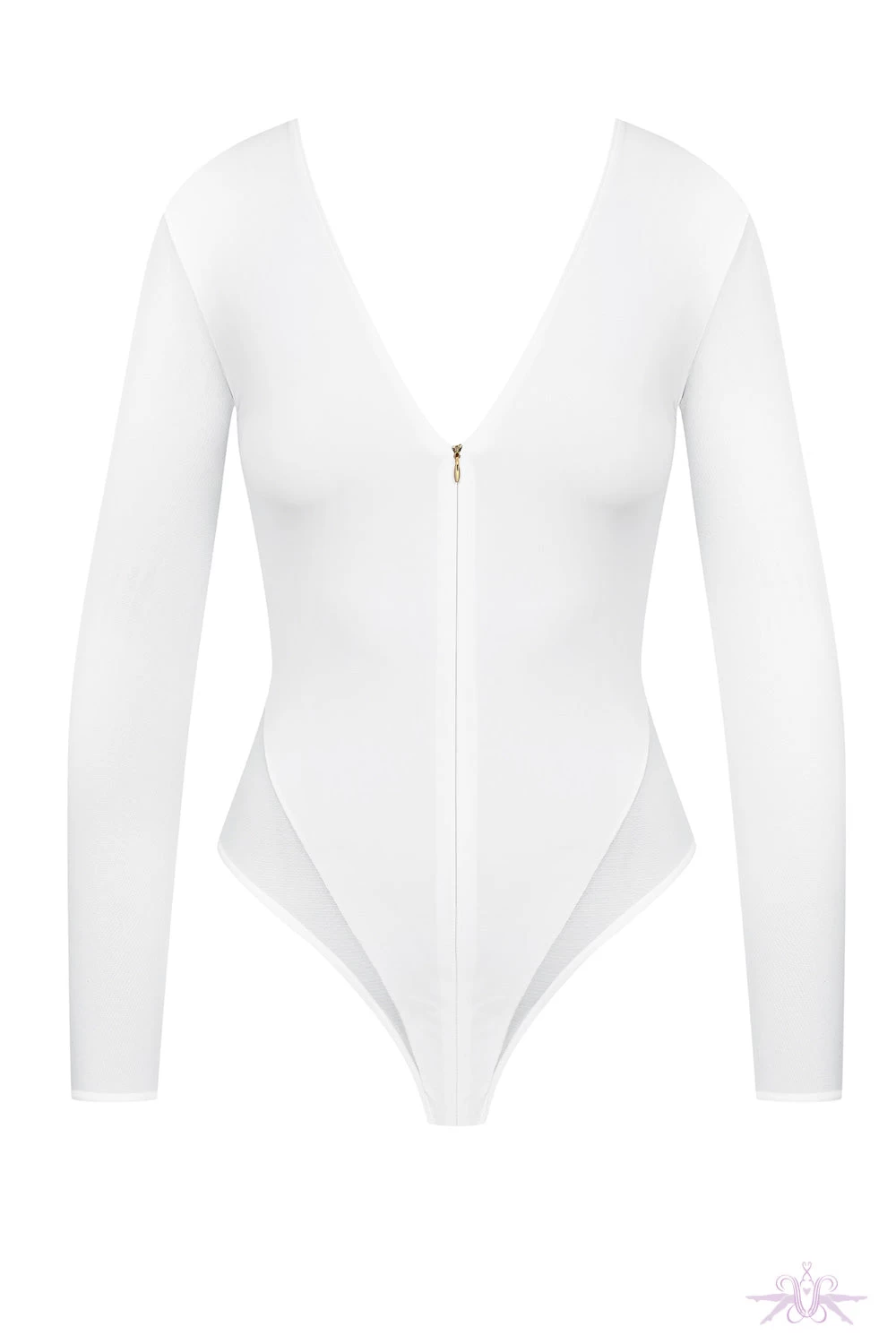 This seductive long sleeved body from the Pure Tentation collection at Maison Close is full of charm and elegance. It combines the softness of the microfibre with the tulle’s semi transparency to create a second skin effect. A v-neckline highlights the breast while the zip at the front yields to temptation.