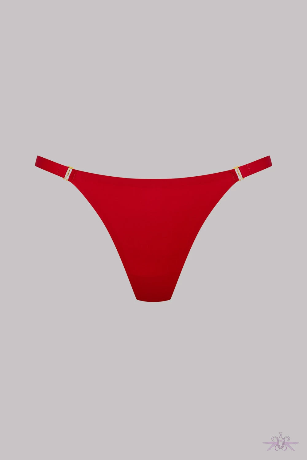A seductive mini thong from the Tapage Nocturne collection at Maison Close. This super soft microfibre thong is so alluring with its gold tone hardware. The waistband is adjustable to ensure a perfect fit and also opens to the front. Pair with the matching cupless triangle bra.Â