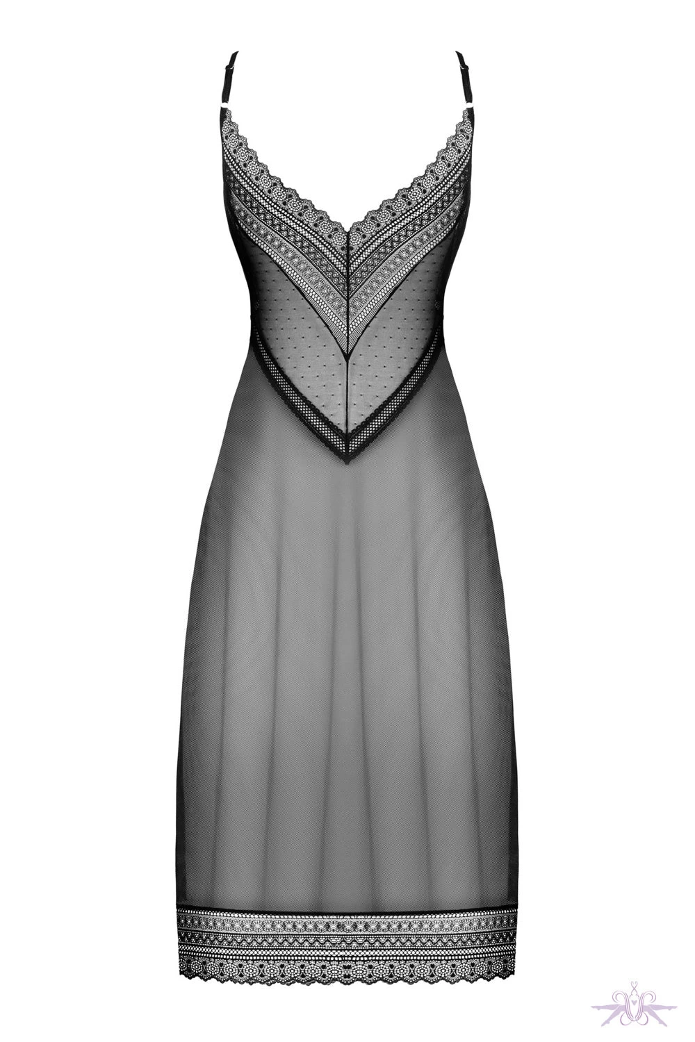 This stylish long nightdress from the Estiqua collection will ignite your senses. The asymmetrical cut will perfectly emphasise the silhouette and the beautifully decorated part of the bra will perfectly emphasise the appearance of the breasts and cleavage, giving you self-confidence. The silver pendant at the waist draws attention and adds elegance, and the sexy, translucent material will ensure the right dose of spice.