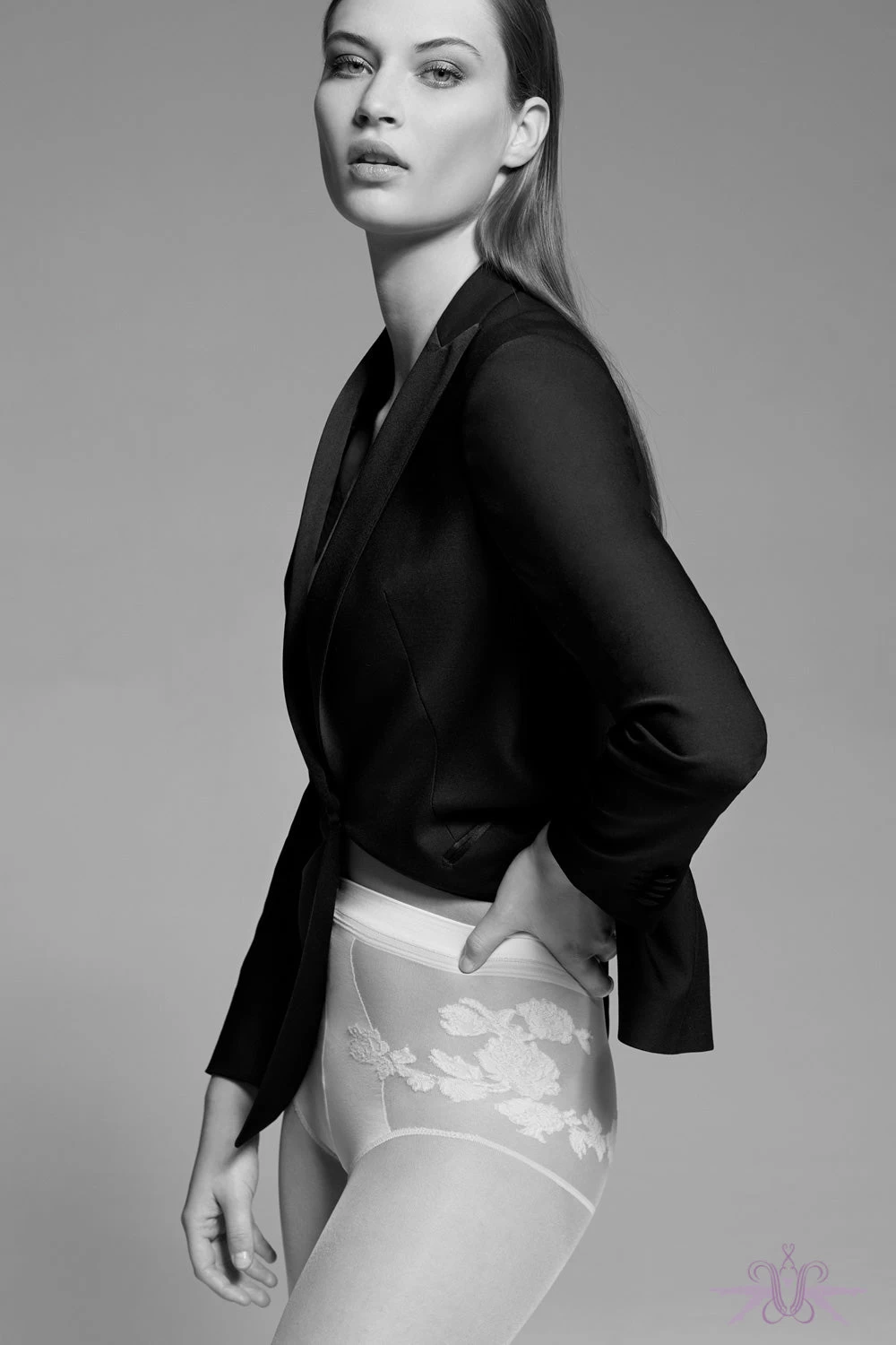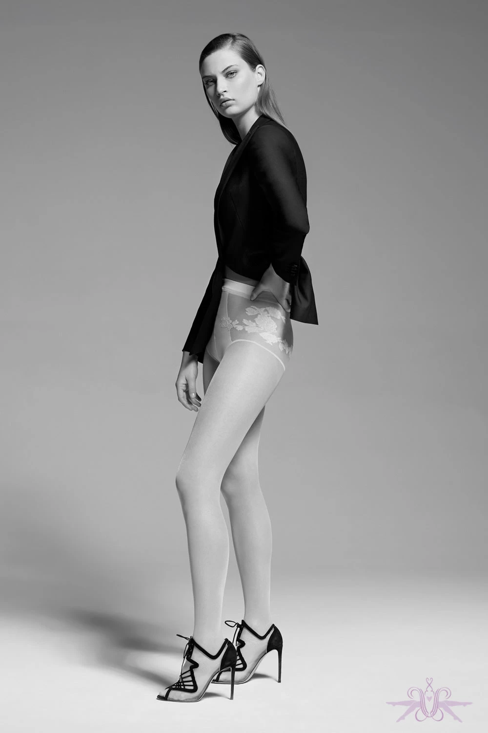 A sumptuous pair of sheer tights with a beautiful classy panty section which is embellished with floral decorations. These 20 denier tights are perfect for all year round. Available in black, nude or (plombe) pewter.Â