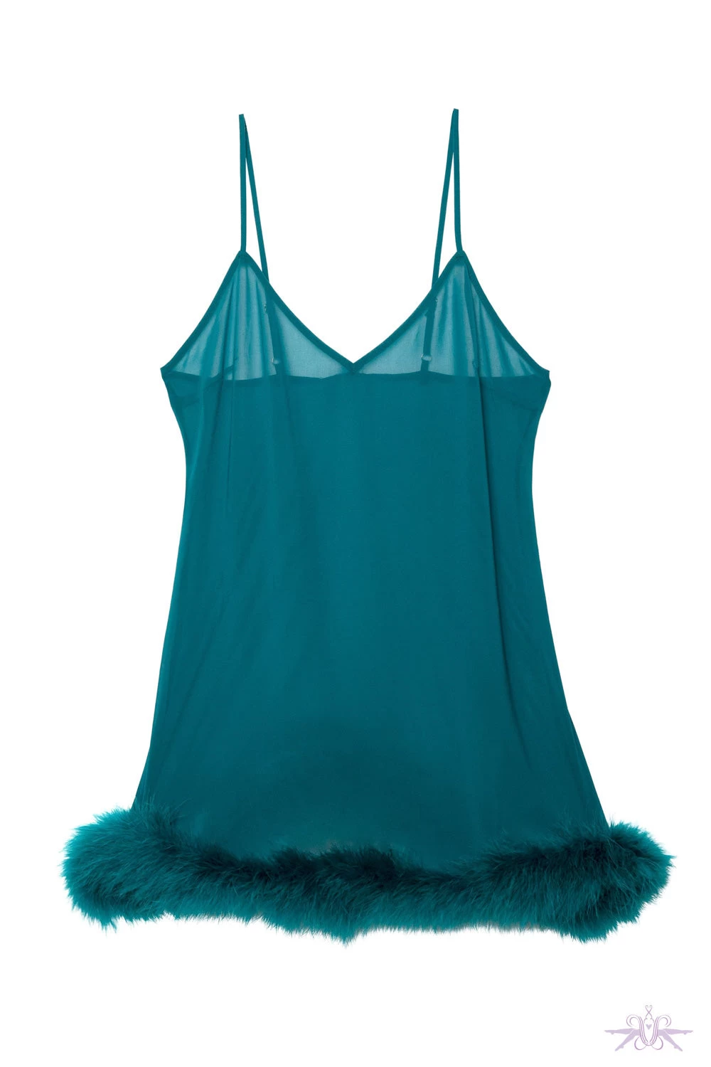 A gorgeous teal babydoll that has glamour and sophistication with its sheer fabric and luxurious faux feather trim. Complete the look with the matching Teal Feather Robe.Â
