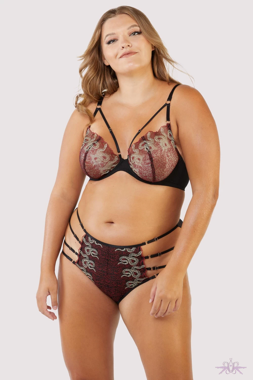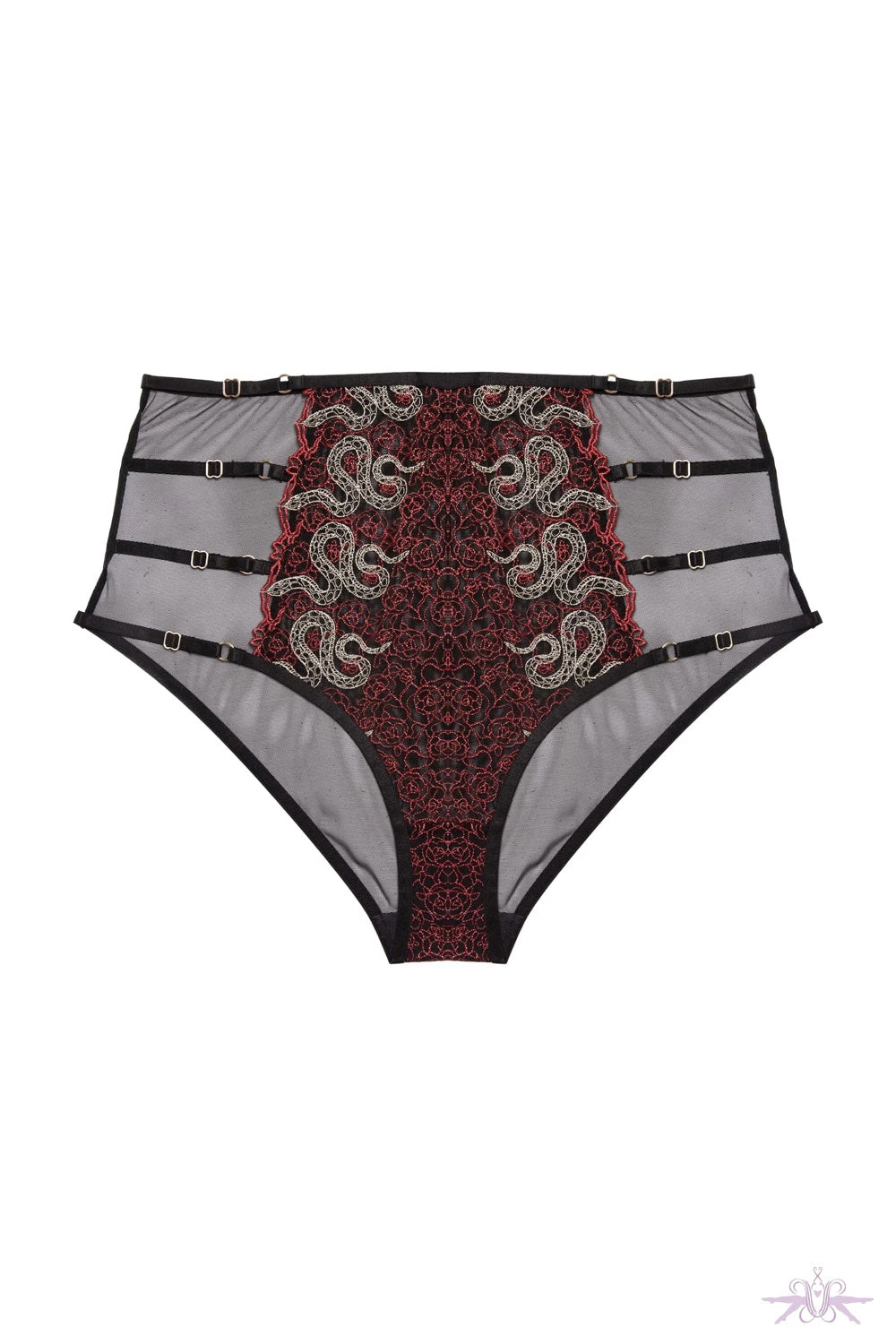 A striking high waist brief from the autumn collection at Playful Promises. This gorgeous brief is in autumnal colours with snake embroidery over black mesh and glistening gold and red embroidered florals. There are four elastic straps to each side that are adjustable.Â