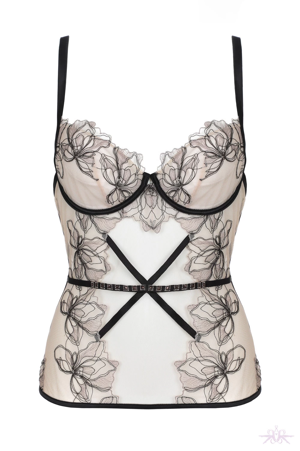 A decadent underwired bodice from the Prelude collection at Jolidon. It is made from nude sheer mesh tulle overlaid with floral mesh lace detail and delicate scalloped edging. The mesh is entwined with black and gold lurex thread which adds sparkle whilst on the front there is a criss cross black elastic adorned with embellishments.Â