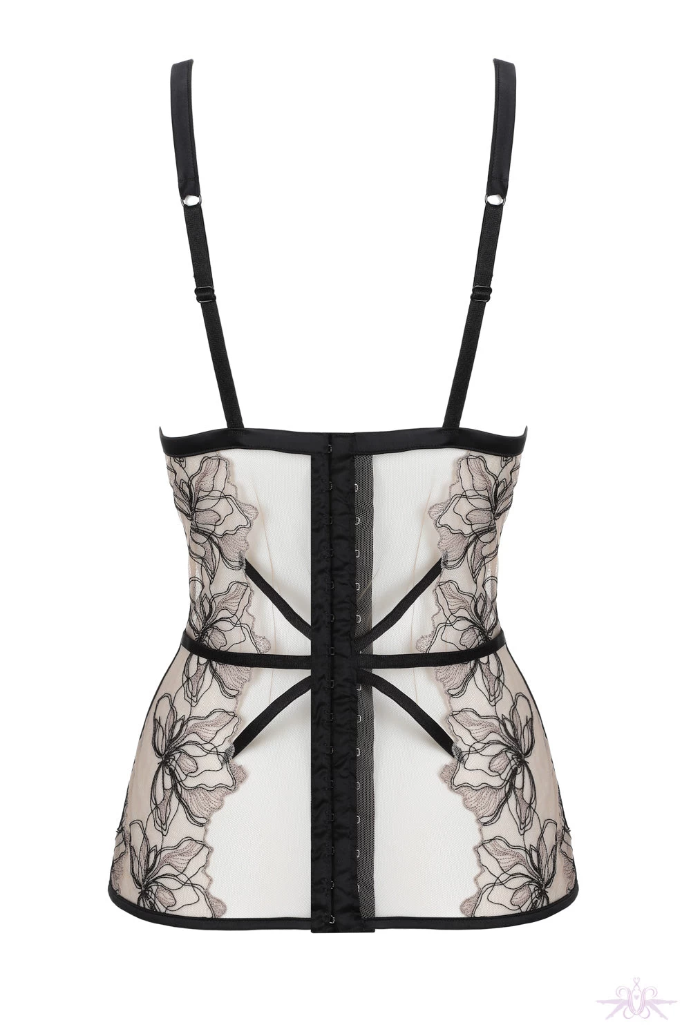 The rear follows the same design as the front along with corset style hook and eye fastening running the length of the bodice. The whole garment is edged in gorgeous black satin. Matching items including the thong are also available in the collection.Â