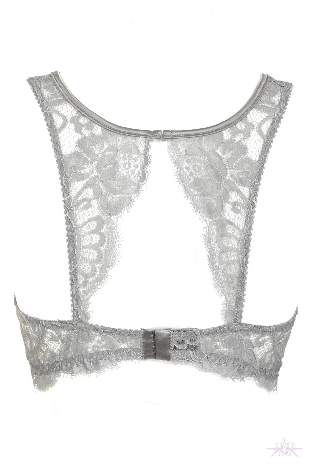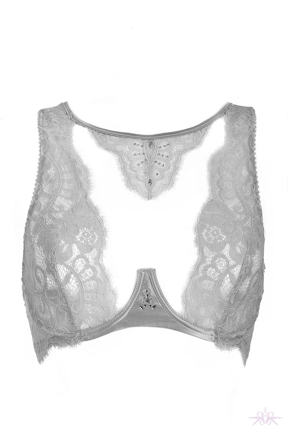 An alluring bra in lace and tulle from the Marlene collection at Prelude Milano. This satin edge underwired bra is truly stunning with the sheer section covering yet enhancing the bust. The triangular section of lace that surrounds the breasts adds a gorgeous feminine accent and the silver Swarovski crystals in the centre add sparkle. The back of the bra has two vertical lace straps which are connected at the top. The bra is fastened by way of a hook and eye.Â