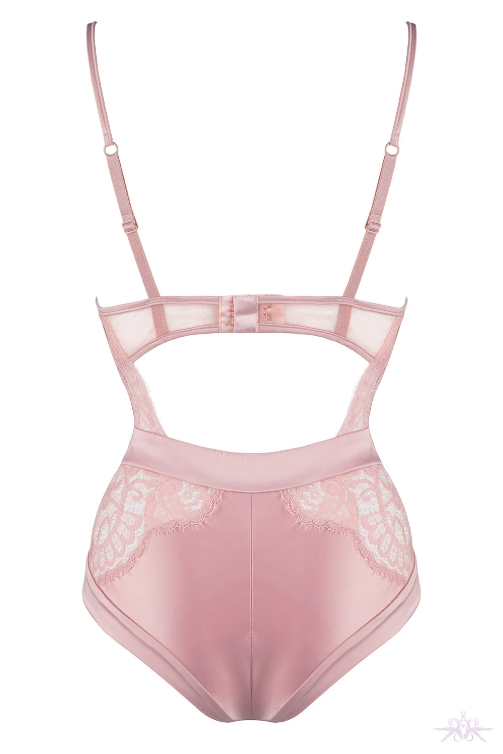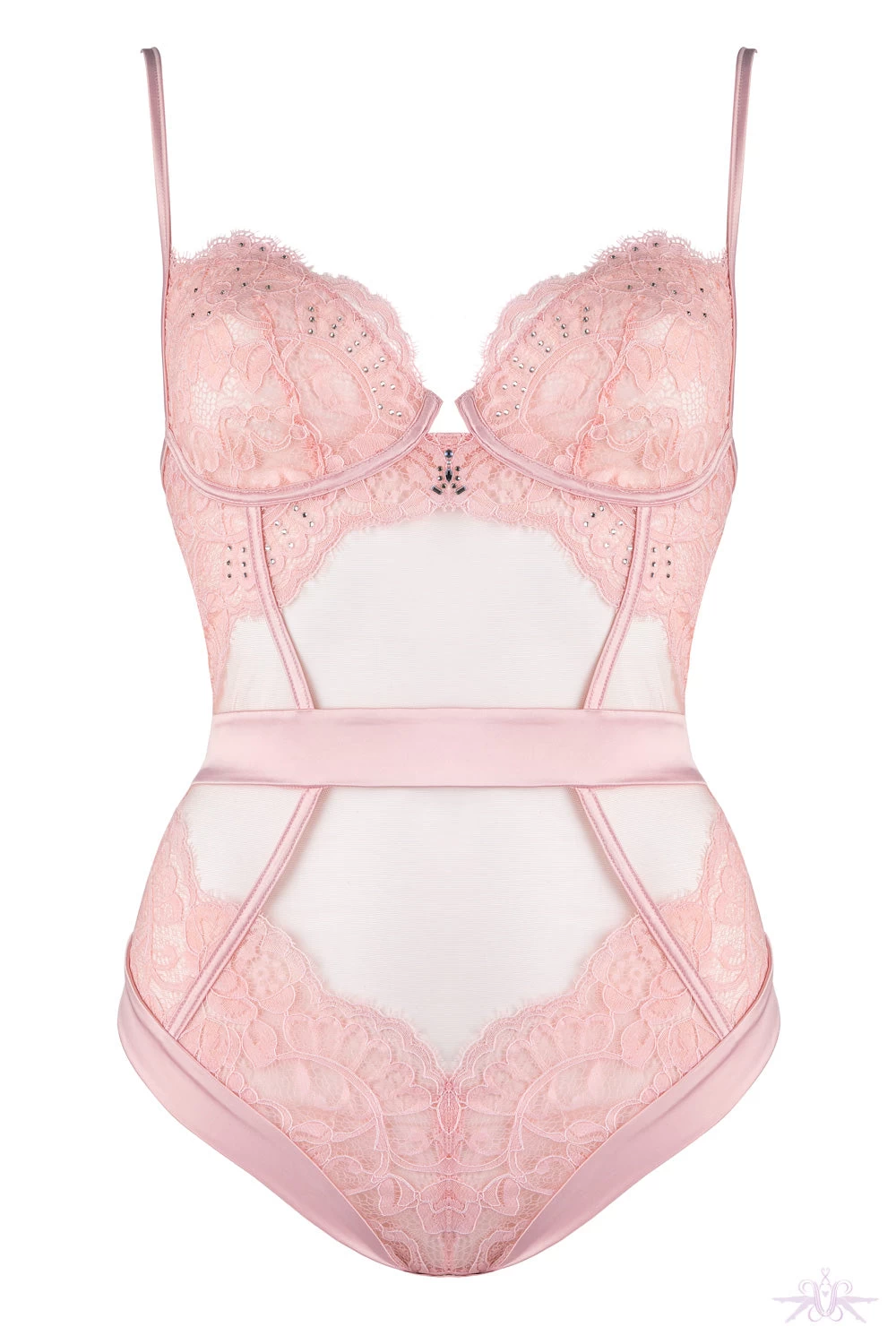This luxurious pink bodysuit from Prelude Milano is stunning with its satin and lace details. The bodysuit has decadent sheer panelling and the lace panels to the front and rear are so glamorous and make this piece of lingerie a real must have. The underwired bra supports and enhances the bust adoringly and the back fastens and adjusts in the usual way. Swarovski crystals on the satin waistband at the front which add glamour and decadence.Â