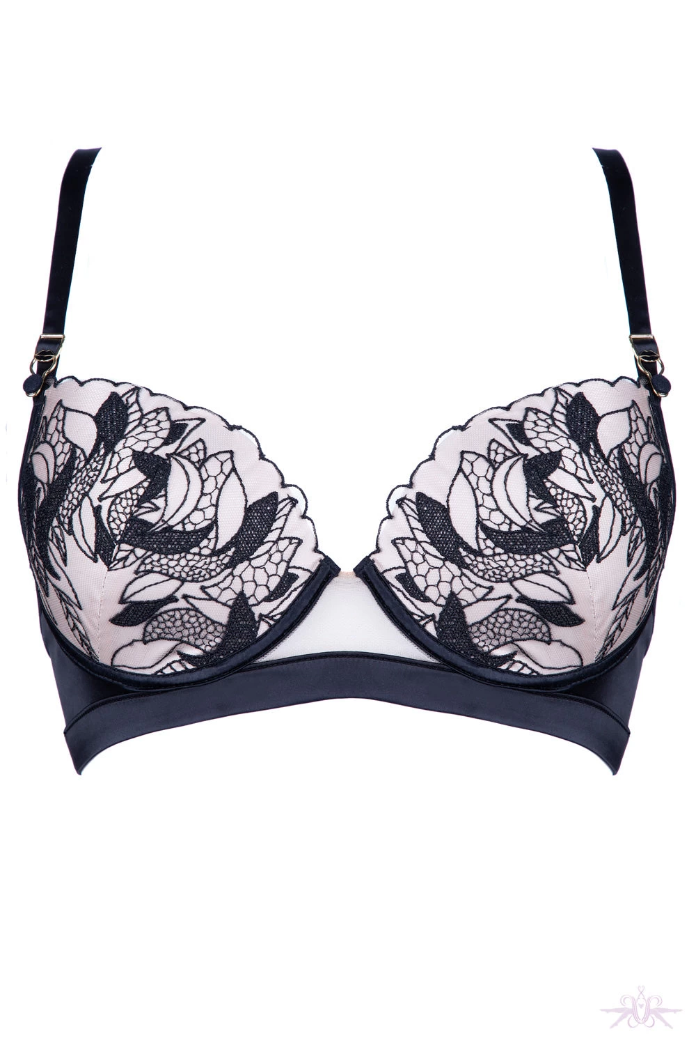 A gorgeous padded push up bra from the Prelude collection at Jolidon. This nude bra is overlaid with floral black lace and lined with black satin. Satin shoulder straps and waistband make this bra so glamorous. The signature suspender clip can be send at the front on the straps. Matching items are also available.Â
