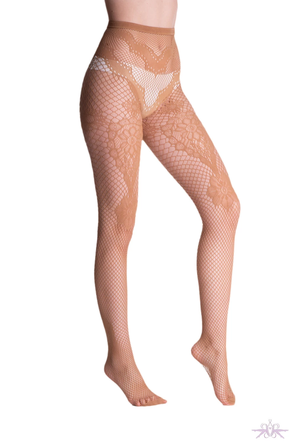 A lovely fishnet tight with floral inset detail from Trasparenze. A medium fishnet with detail to the thigh and ankle. Beautifully refined and elegant.Â